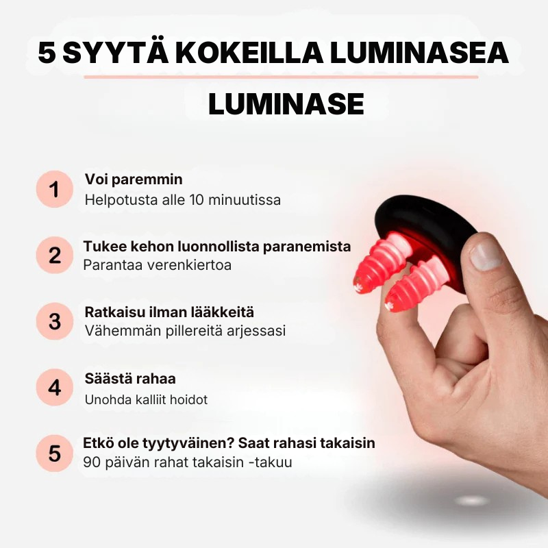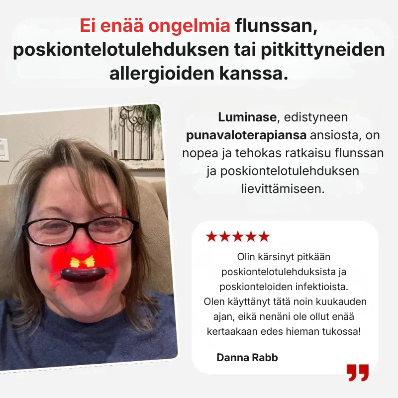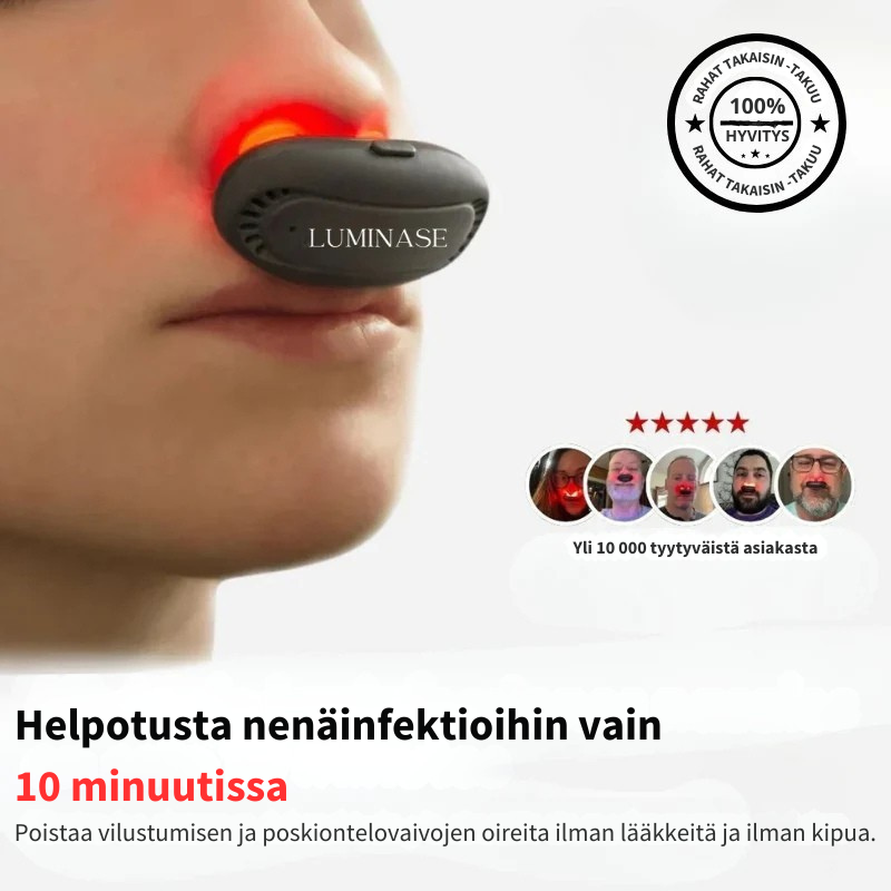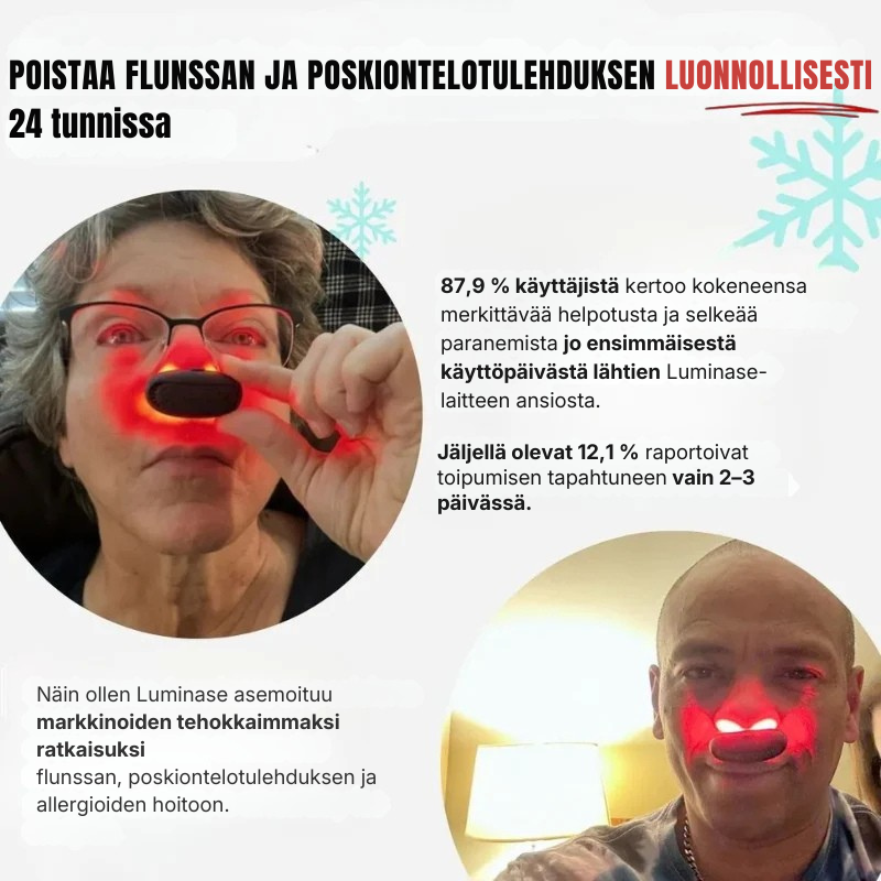 Se lievittää nenän tukkoisuutta, poskiontelovaivoja ja kurkkukipua vain 10 minuutin päivittäisellä käytöllä. Luminase käyttää 660 nm:n punaista valoa tulehduksen vähentämiseen ja kehon luonnollisten puolustusmekanismien vahvistamiseen ilman lääkkeitä tai sivuvaikutuksia.