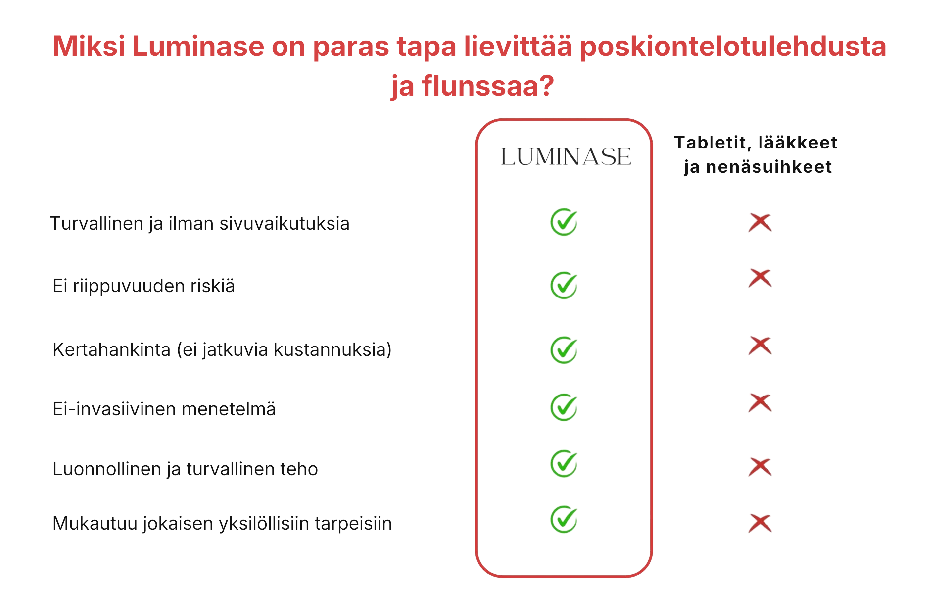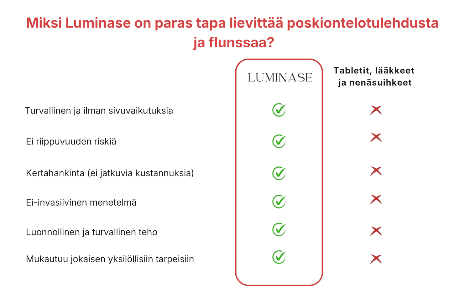Tämän ansiosta Luminase sijoittuu markkinoiden tehokkaimpien ratkaisujen joukkoon vilustumisen, poskiontelovaivojen ja allergioiden lievittämisessä.